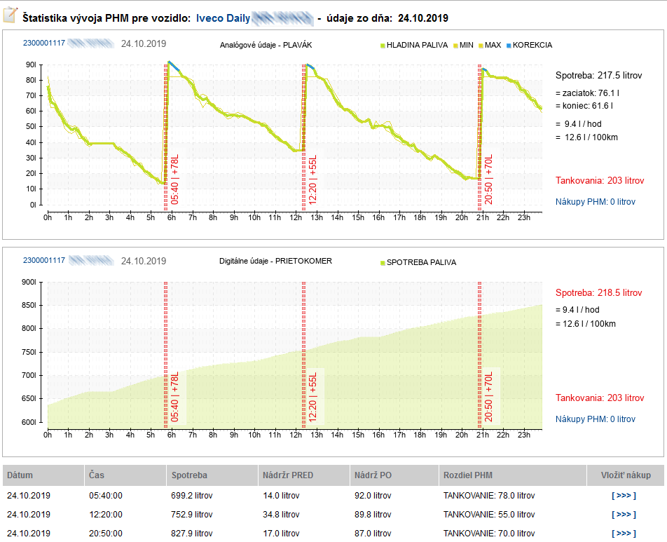Jednou z predností nášho systému GPS monitoringu vozidiel je veľmi presné meranie spotreby u dodávkových vozidiel. Ako údaje z plaváku tak aj údaje z elektronického prietokomeru vykazujú presnosť do 1% spotreby PHM. Takúto vysoká presnosť sa nám podarilo dosiahnuť vďaka elektronickej filtrácií všetkých známych aj menej známych nepresností anomálií riadiaca jednotka vozidiel zvyčajne vykazuje. Pozrite sa na vizualizáciu jedného dňa prevádzky IVECO DAILY, presnosť nameraných údajov je +/- 1 LITER: